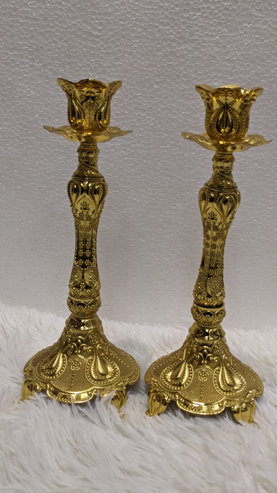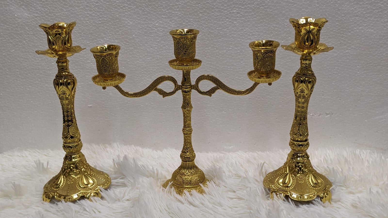 This brass candle holder set of three includes a refined three-arm candelabra and two single candle holders, designed to add a touch of timeless elegance to any setting. Perfect for weddings, parties, or birthday celebrations, these pieces create a warm and inviting atmosphere with candlelight. Ideal for home decor, restaurants, or hotel tables, the set combines classic charm with versatile style, making it a beautiful addition to both everyday and special occasion spaces.