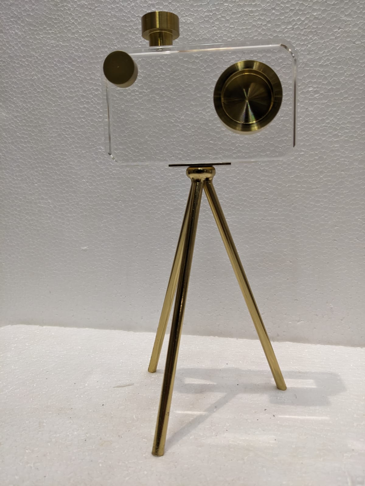 This decorative piece blends modern design with a touch of luxury, featuring a camera-inspired shape crafted from high-quality metal and embellished with golden finishes and crystal details. With its sleek structure and eye-catching shine, it serves as a bold accent for shelves, workspaces, or coffee tables. Ideal for photography lovers or those looking to add a unique statement to their decor, this piece captures the spirit of style and creativity in one elegant form.